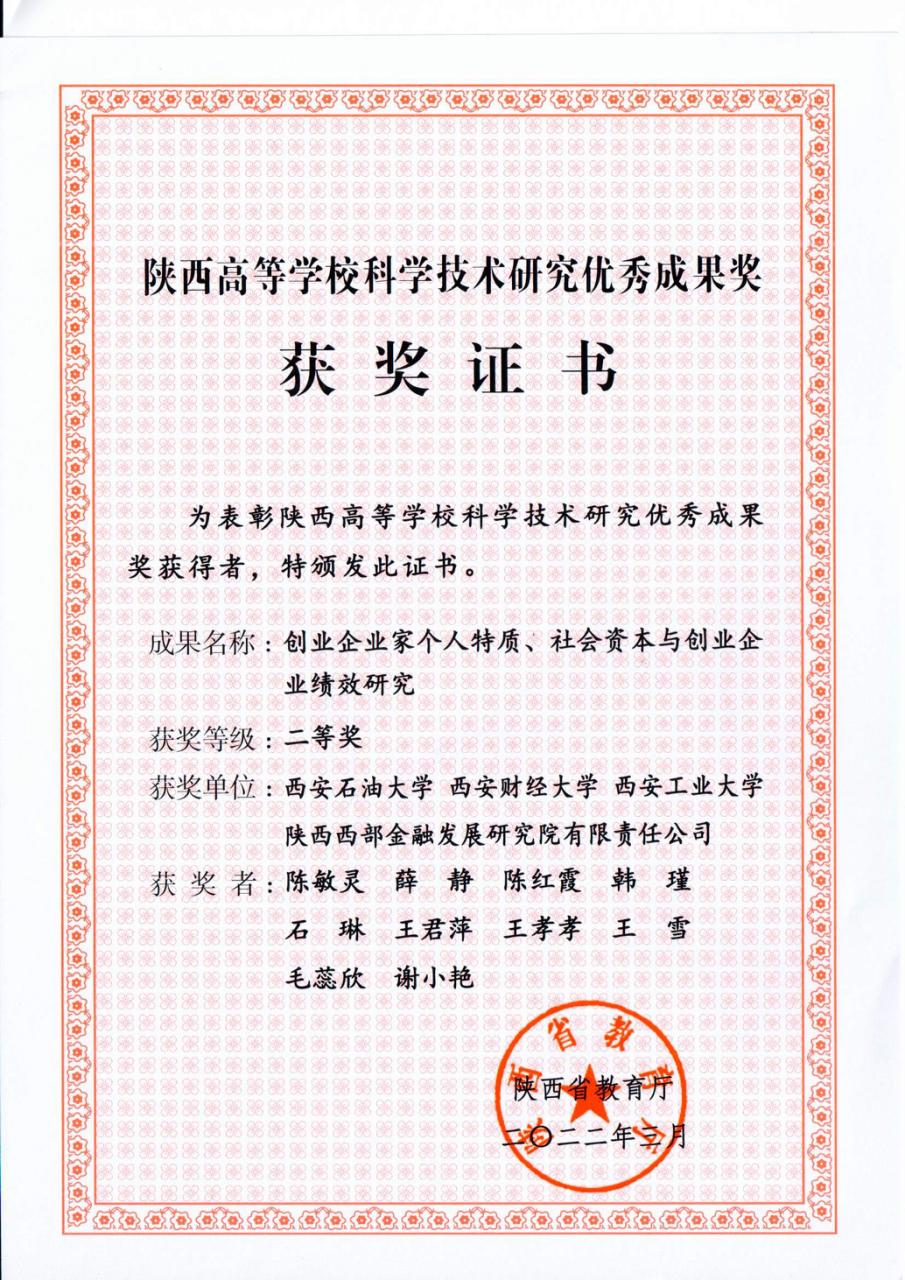 2022年2月,陜西省教育廳公布了陜西省高等學(xué)校科學(xué)技術(shù)研究優(yōu)秀成果獎獲獎名單,我校陳敏靈、薛靜老師的研究報告《創(chuàng)業(yè)者個人特質(zhì)、社會資本與創(chuàng)業(yè)企業(yè)績效研究》獲得二等獎。