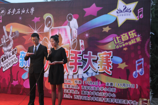11月4日17時40分,西安石油大學經(jīng)濟管理學院新聲力歌手大賽初賽在新校區(qū)小吃街拉開帷幕。參加本次大賽的評委有經(jīng)濟管理學院團學指導老師張倩、2015級輔導員孫劍秋老師、王曉天老師以及2014屆新聲力優(yōu)秀選手等。