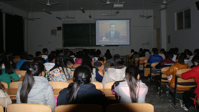 、221、223、225教室觀看了李克強總理的經(jīng)濟公開課視頻,其內(nèi)容是李克強總理在中國工會第十六次全國代表大會上做的經(jīng)濟形勢報告,展現(xiàn)了李克強總