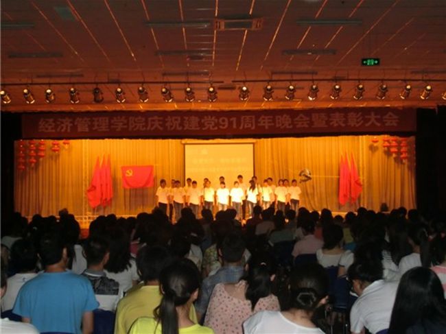 2012年6月21日晚7點半,經(jīng)濟(jì)管理學(xué)院慶祝建黨91周年晚會暨表彰大會在我校新校區(qū)騰輝大學(xué)生活動中心隆重舉行。出席本次表彰大會的有:經(jīng)濟(jì)