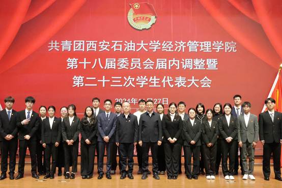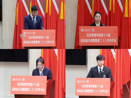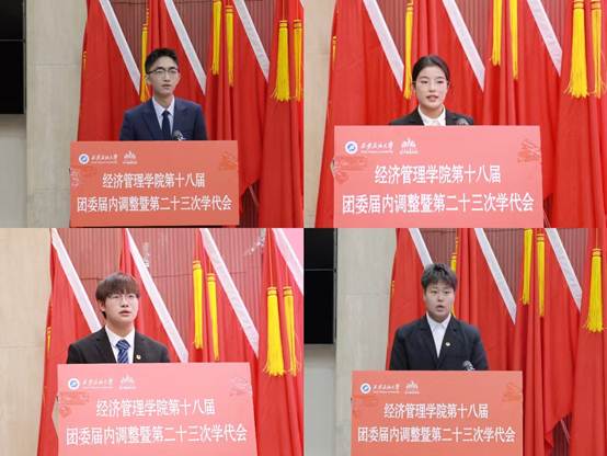 會(huì)上,學(xué)院團(tuán)委書記李博文宣讀了《共青團(tuán)西安石油大學(xué)經(jīng)濟(jì)管理學(xué)院委員會(huì)關(guān)于第十八屆委員會(huì)組織成員調(diào)整任命的通知》,新任團(tuán)委委員依次表態(tài)發(fā)言。團(tuán)學(xué)指導(dǎo)老師任仰宣讀了《第二十三次學(xué)生代表大會(huì)選舉辦法》,與會(huì)代表選舉產(chǎn)生了新一屆學(xué)生委員會(huì)委員。石油工程學(xué)院學(xué)生會(huì)執(zhí)行主席李陽(yáng)代表各兄弟院(系)學(xué)生會(huì)致以祝詞,對(duì)經(jīng)濟(jì)管理學(xué)院團(tuán)學(xué)工作的成績(jī)表示祝賀,表示將保持密切聯(lián)系,攜手共進(jìn)。大會(huì)聽(tīng)取并審議通過(guò)了《大會(huì)籌備工作報(bào)告》《第二十二屆學(xué)生會(huì)年度工作報(bào)告》和《大會(huì)提案工作報(bào)告》,新任團(tuán)委委員、當(dāng)選學(xué)生委員會(huì)委員面向團(tuán)旗進(jìn)行了莊嚴(yán)宣誓。
