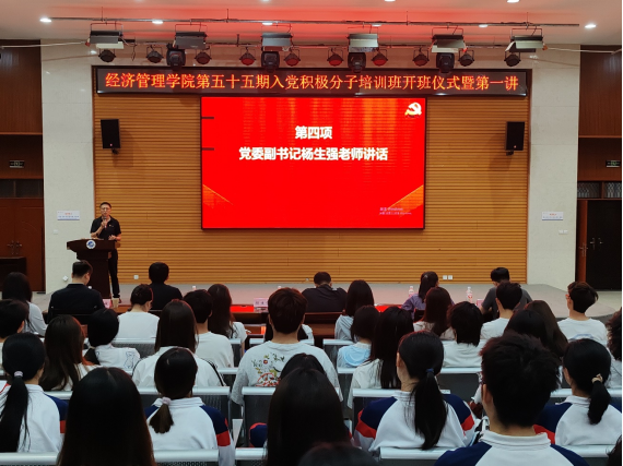 經(jīng)濟(jì)管理學(xué)院黨委副書記楊生強(qiáng)在開班典禮上講話。他代表經(jīng)濟(jì)管理學(xué)院黨委對參加本次培訓(xùn)的入黨積極分子表示祝賀,對籌備本次培訓(xùn)辛勤付出的黨工辦學(xué)生干部表示感謝。他對本期入黨積極分子參加培訓(xùn)提出三點要求:一是要明確培訓(xùn)意義,端正入黨動機(jī);二是要珍惜學(xué)習(xí)機(jī)會,提升綜合素養(yǎng);三是要嚴(yán)守紀(jì)律要求,樹立良好形象,四是要以青春之我,擔(dān)時代之責(zé)。以本次培訓(xùn)為起點,做到心中有信仰,堅定對馬克思主義的信仰、對中國特色社會主義的信念;肩上有擔(dān)當(dāng),在學(xué)習(xí)中勇攀高峰,在實踐中服務(wù)社會,用奮斗擦亮青春底色;腳下有方向,始終與黨和人民同向同行,努力成長為堪當(dāng)民族復(fù)興大任的時代新人。
