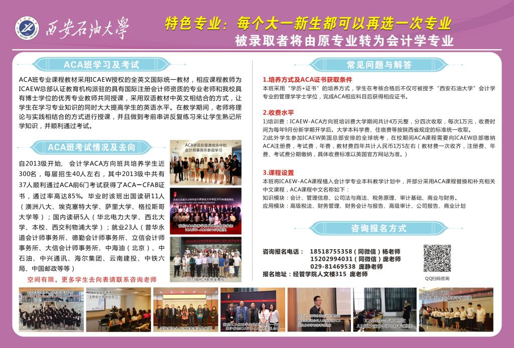 經(jīng)學(xué)校批準(zhǔn),經(jīng)管學(xué)院于2013年引入全球領(lǐng)先的會計師組織“英格蘭及威爾士特許會計師協(xié)會ICAEW的英國皇家特許會計師ACA課程”,開辦會計學(xué)國際注冊會計師ACA方向班。該班制定專門的培養(yǎng)方案,采用“學(xué)歷+國際注冊會計師證書”雙證書的培養(yǎng)方式,為學(xué)生提供高標(biāo)準(zhǔn)專業(yè)教育,使其符合會計職業(yè)國際化發(fā)展要求,成為國際精英型人才,能夠進(jìn)入大型跨國公司與機(jī)構(gòu)施展才華。