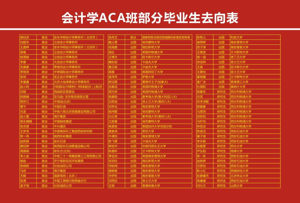該班畢業(yè)生英語水平高(英語四級通過率100%、英語六級通過率90%以上)、精通財會金融專業(yè)英語、職業(yè)發(fā)展路線明確、就業(yè)率和就業(yè)層次高、部分學(xué)生畢業(yè)即可進(jìn)入四大會計師事務(wù)、延長石油、中海油等知名企業(yè)。每年保研、考研、出國的學(xué)生所去學(xué)校有:西安交通大學(xué)、西交利物浦大學(xué)和格拉斯哥大學(xué)、昆士蘭大學(xué)等QS世界排名100以內(nèi)的高等學(xué)府。